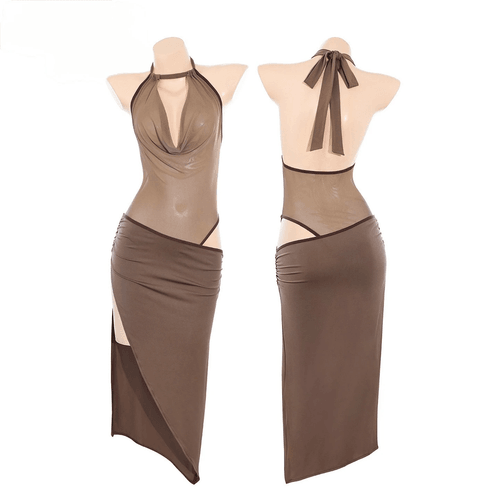 垂墜式深V領口自然展現迷人鎖骨與胸型曲線,搭配露背蝴蝶結綁帶設計,整體造型更加優雅性感。